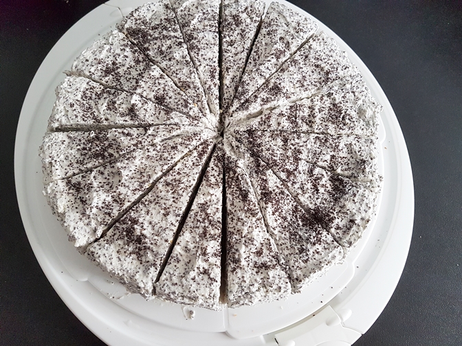 Wenn der Boden fertig gebacken ist, solltet ihr eine Weile warten, bis er abgekühlt ist. Dann könnt ihr zunächst die Mangostücken gleichmäßig darauf verteilen, einen Tortenring darumlegen und anschließend die Sahne ebenfalls gleichmäßig auf dem Boden glattstreichen. Anschließend solltet ihr die Torte noch für ein paar Stunden oder über Nacht kaltstellen. So könnt ihr den Tortenring besser lösen. Ich habe ein wenig von der Sahne übrig behalten, mit der ich schließlich die Seiten verziert habe. Außerdem habe ich noch ein paar Mohnsamen zum Verzieren genutzt.